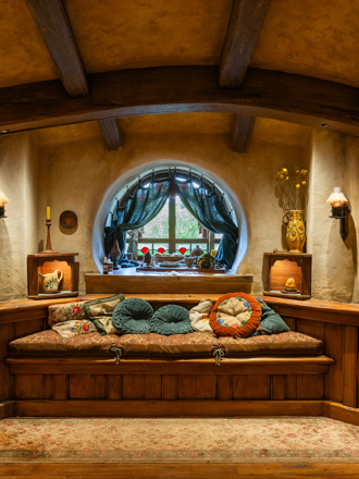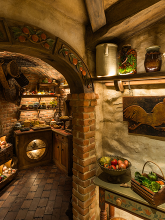 Mind your head as you wander and weave through the maze of rooms and hallways, all constructed with a Hobbit’s stature in mind. Intricate hand-painted details and carvings adorn the walls, complemented with a plethora of colourful hand-stitched linens and decorative flourishes throughout.