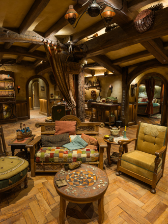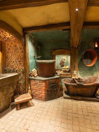 Mind your head as you wander and weave through the maze of rooms and hallways, all constructed with a Hobbit’s stature in mind. Intricate hand-painted details and carvings adorn the walls, complemented with a plethora of colourful hand-stitched linens and decorative flourishes throughout.